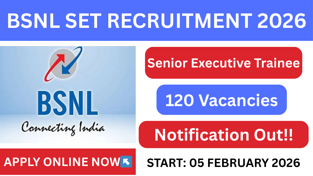 The Bharat Sanchar Nigam Limited (BSNL) has officially released the BSNL Senior Executive Trainee  recruitment 2026 notification for 120 Senior Executive Trainee (SET) positions for the 2026 cycle. The BSNL Senior Executive Trainee Vacancy 2026 online application portal is set to open in 05 February 2026 for both Telecom and Finance streams and candidates can apply until 07 March 2026. The minimum age is 21 Years & the maximum age is 30 years as of 07 March 2026. Candidates must check the complete details for the BSNL Senior Executive Trainee Notification 2026 Get Admit Card, Exam Date, Eligibility, Application Date & More Below.
